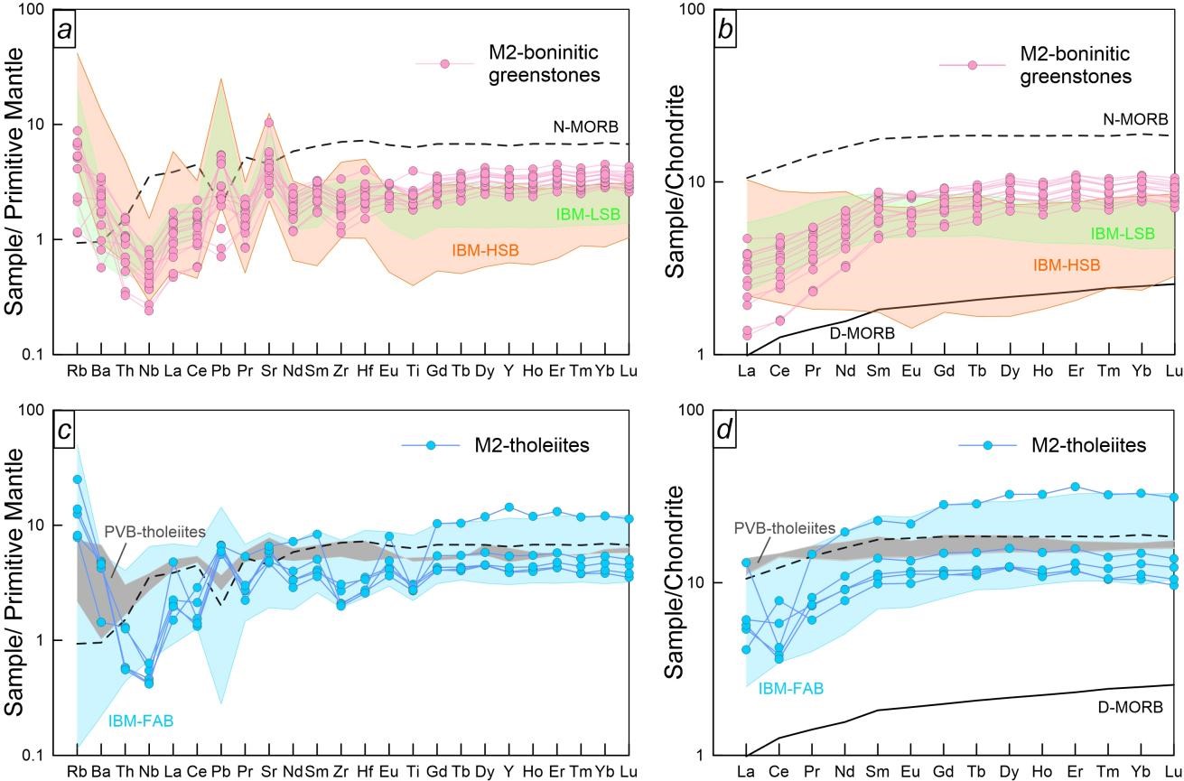 图3 马里亚纳俯冲带最南端M2站位的和玻安质绿岩(a-b)和火山岩样品(c-d)的微量元素蛛网图和稀土元素配分形式图