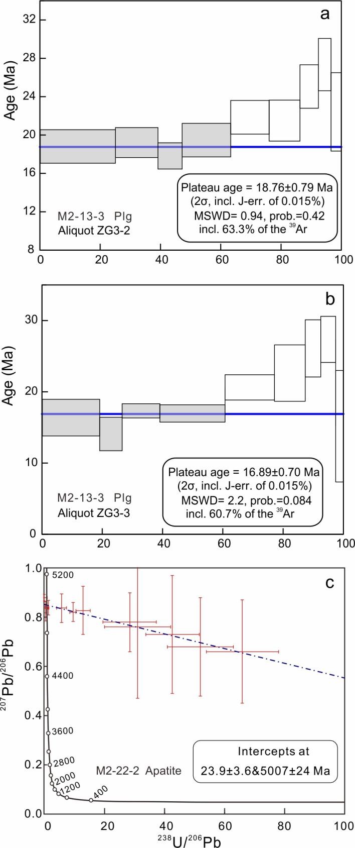 图4 火山岩样品(M2-13-3)的斜长石Ar-Ar定年结果(a–b);变质岩样品(M2-22-2)的磷灰石U-Pb定年结果(c)