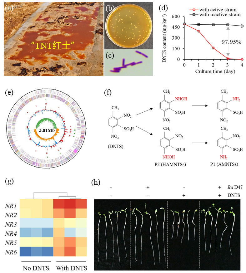 为了解析该菌株代谢DNTS的分子机制,研究人员对该菌株进行了全基因组测序,结果显示B. altitudinis D47菌株的基因组全长3.81 Mb;通过胁迫转录组分析发现该菌株中的多个硝基还原酶(Nitroreductase, NR)在DNTS胁迫条件下显著上调。进一步体外酶活分析表明这些NRs在DNTS降解过程中发挥重要作用。另外,研究人员选择紫花苜蓿作为研究材料,分别使用添加和未添加B. altitudinis D47的含DNTS平板对紫花苜蓿幼苗处理分析,结果显示添加B. altitudinis D47后,DNTS对紫花苜蓿根伸长和生物量的抑制效应显著降低。上述研究表明B. altitudinis D47不但可以作为微生物菌剂与植物一起用于“TNT红土”修复,而且B. altitudinis D47中含有的硝基还原酶基因资源也可以用于植物基因工程,从而赋予修复植物更高的DNTS降解效率。因此该微生物菌株与微生物基因资源的综合利用,有望为今后“TNT红土”的高效生物修复提供新的途径。