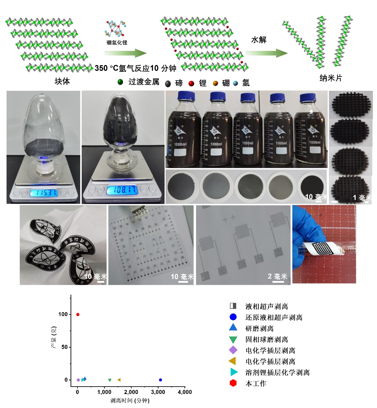 本工作中,吴忠帅团队提出了一种固相化学插层剥离新方法,通过高温固相反应降低插层反应的活化能,创新性地筛选出了一种固相插层试剂——硼氢化锂,硼氢化锂具有强还原性质,在干燥空气中稳定,可用于实现高温固相插锂反应,克服了插层反应速度慢的问题,从而实现安全、高效、快速的插层剥离。整个插层剥离过程只需短短10分钟,可宏量制备出百克级(108克)的碲化铌纳米片,与此前研究制备量均小于1克比,提升了两个数量级。重要的是,该方法具有普适性,此方法成功制备出了五种不同过渡金属的碲化物纳米片(MoTe2、WTe2、NbTe2、TaTe2和TiTe2)和十二种合金化合物纳米片,丰富了二维材料体系库,实现了材料功能化、定制化制备。此外,团队还观察到多种有趣量子现象,例如MoTe2纳米片具有依赖于厚度的金属-绝缘体相变,WTe2纳米片具有巨磁电阻和舒勃尼科夫-德哈斯效应等。