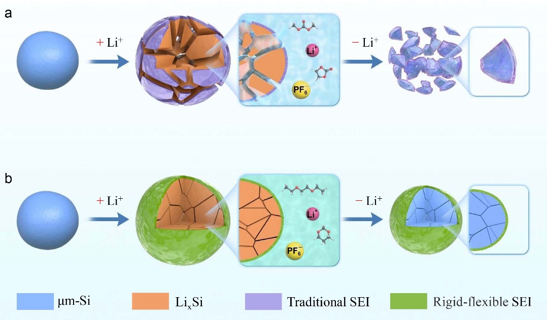 相比于传统纳米硅负极,微米硅负极在材料成本、振实密度、电极制备工艺方面具有巨大的优势。研究发现,在光伏硅片切割过程中产生的光伏硅废料具有成本低廉、来源广泛及纯度高等优势,可以作为微米硅负极材料的理想来源。由于微米级硅颗粒在锂化过程中会产生近300%的体积膨胀,导致其极易破碎粉化进而引发容量的急速衰减。传统微米硅负极的改性方法主要集中于对其进行碳包覆或引入高强度粘结剂,虽然此类改性方式取得了一定的效果,但距离商业化库伦效率超过99.9%的要求还存有较大差距。