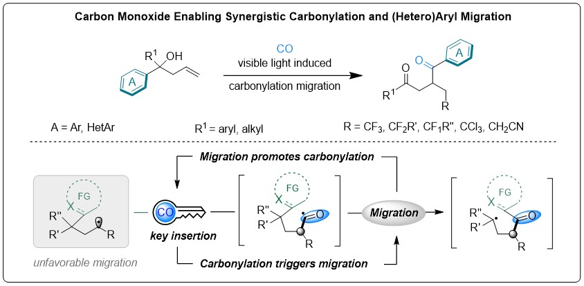 在传统的插羰反应中,研究人员一直专注于开发不同的催化体系以实现CO的活化,将CO这一最简单的C1合成子引入生成各种活性酰基中间体,然后直接淬灭完成羰基化转化,合成高附加值的含羰基化合物。然而,CO分子的功能化应用却较少被关注。基于此,该团队尝试探索利用CO的插入实现原位增碳,延长碳链为(杂)芳基基团的远程迁移构建桥梁,同时借助基团迁移的速率优势促进碳自由基更有效地捕获CO。